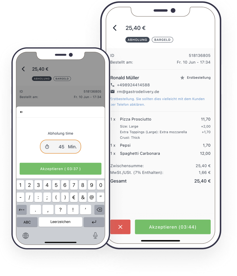 Sobald eine Bestellung eingegangen ist, erhältst Du sofort eine Benachrichtigung auf Deinem Gerät. Die Bestellung wird nahtlos in Dein System übertragen, sodass Du sie sofort bearbeiten und zubereiten kannst.